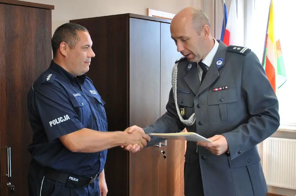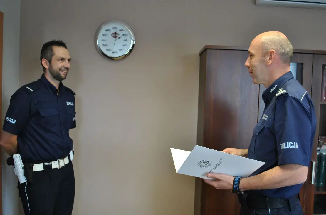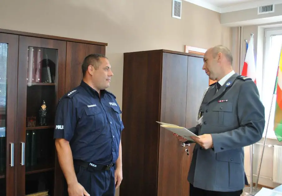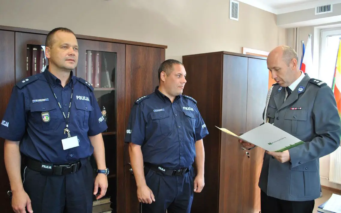 Asp. szt. Maciej Chalecki i st. post. Marcin Sala dostali nagrody za szczególne osiągnięcia. Nagrody przekazał im komendant zielonogórskiej policji mł. insp. Jarosław Tchorowski.