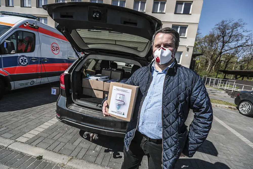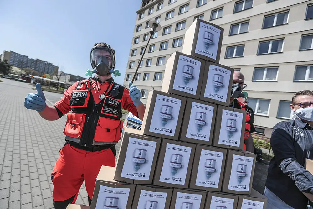Elżbieta i Leszek Jarząbkowie z EBF Development sfinansowali zakup pierwszych 40 urządzeń dla Wojewódzkiej Stacji Pogotowia Ratunkowego SPZOZ w Zielonej Górze. Maski przekazał Decathlon Polska. Fundacja Laboratorium poszukuje sponsorów, którzy chcieliby sfinansować zakup części do kolejnych 120 urządzeń, na które czekają pracownicy Szpitala Uniwersyteckiego w Zielonej Górze.