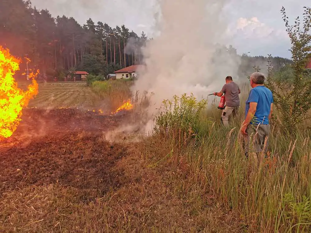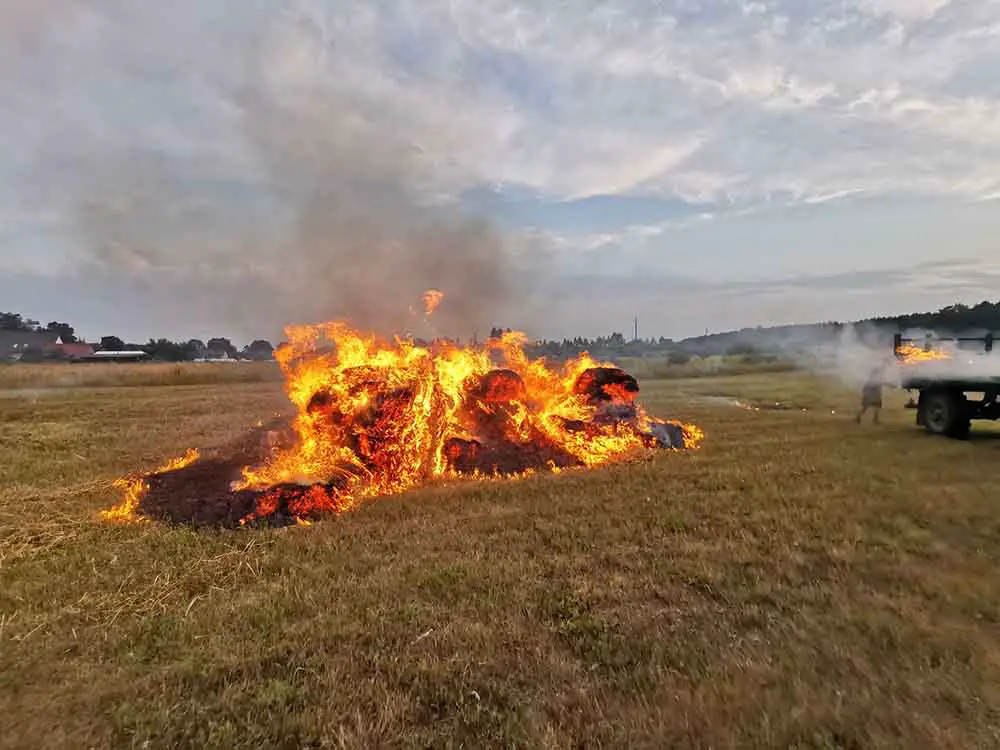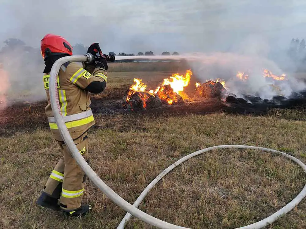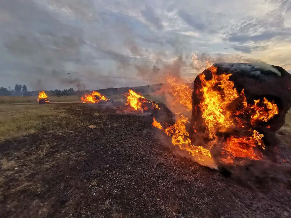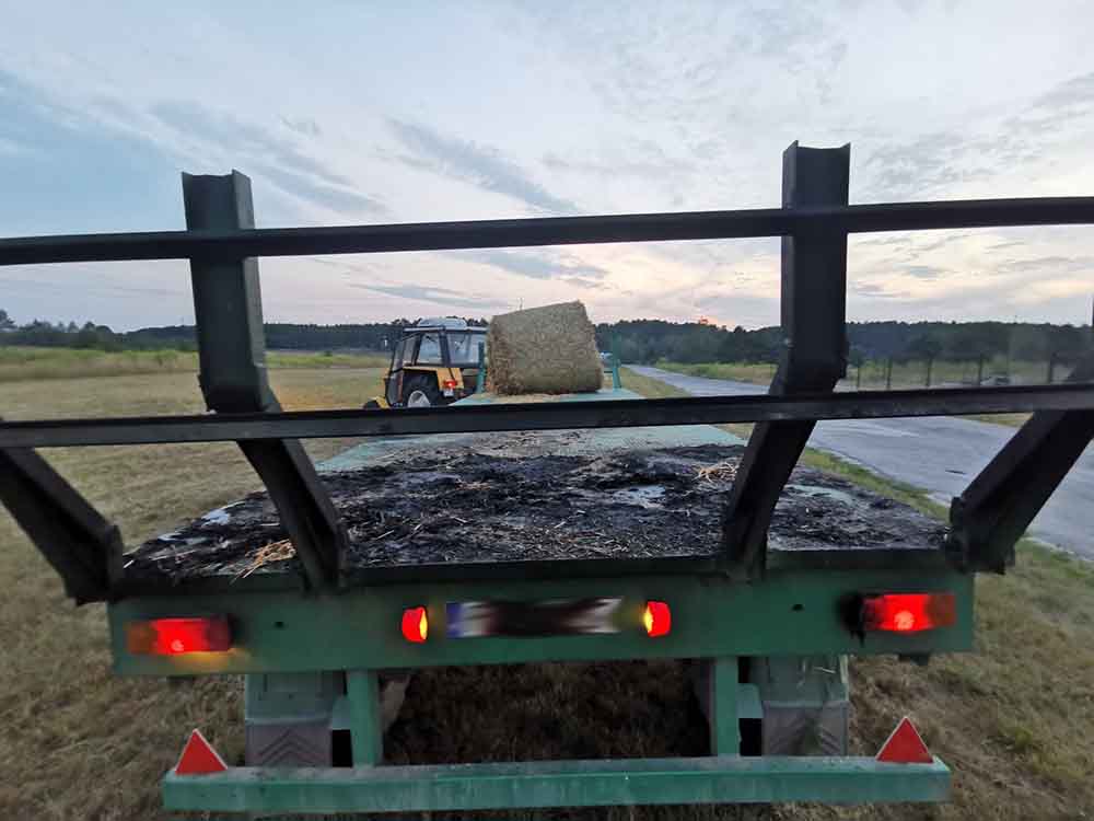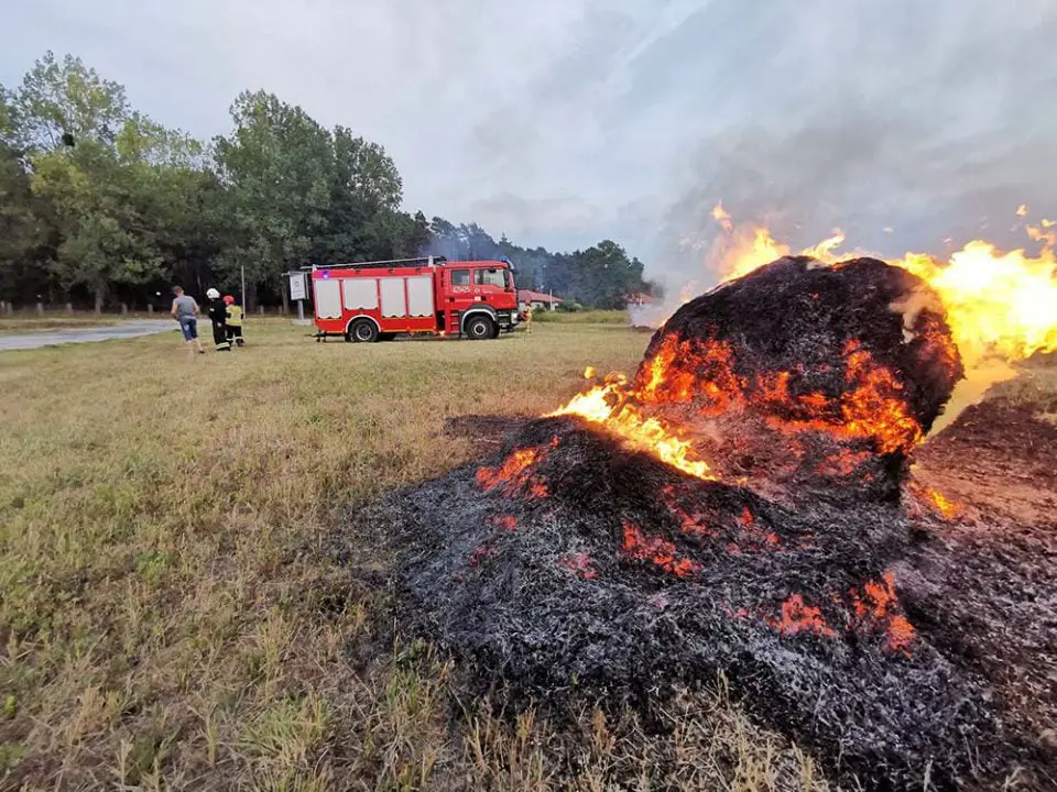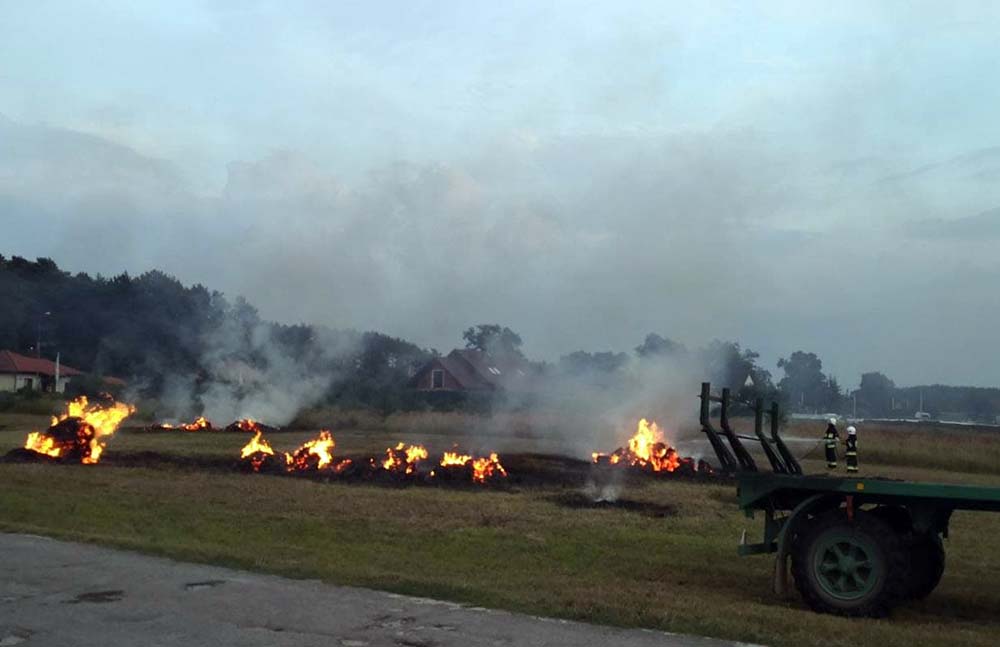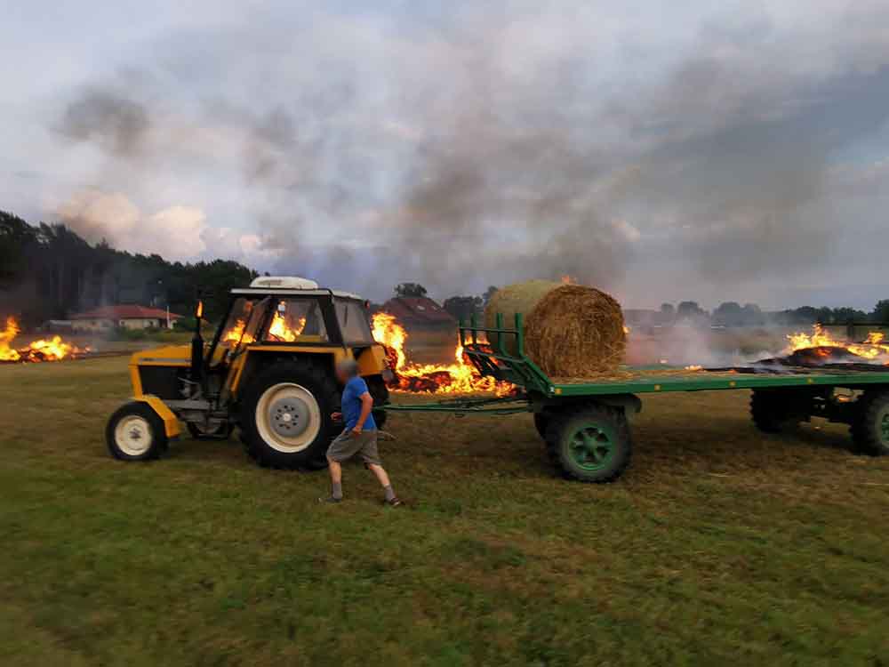 Leszek Kazimierczak-Piwko, wykładowca Uniwersytetu Zielonogórskiego jechał z rodziną do Łagowa. W Gronowie z samochodu zauważył traktor ciągnący przyczepię z balotami słomy. – Zobaczyłem dym unoszący się z przyczepny, którego nie widział kierujący traktorem – opowiada L. Kazimierczak-Piwko. Zielonogórzanin natychmiast zatrzymał się i zaczął krzyczeć do kierowcy traktora ostrzegając go. Po chwili pojawił się ogień. Kierujący traktorem zaczął jechać tak, żeby zrzucać słomę, która błyskawicznie stanęła w ogniu. Ogień zapalił łąkę. – Zabrałem z samochodu gaśnicę i zacząłem gasić płomienie, żeby nie przedostawały się w kierunku domów – opowiada Leszek. Na miejsce dojechały wozy zawodowej straży pożarnej ze Świebodzina oraz OSP i zgasiły płonące baloty słomy – Na szczęście udało się uratować traktor przed spaleniem – mówi L. Kazimierczak-Piwko. Starszy pan, który wiózł słomę z pola syna, nie krył radości i wdzięczności za reakcję pana Leszka. – Zrobiłem to, co zrobiłby każdy na moim miejscu – mówi pan Leszek. Zdjęcia i film z miejsca zdarzenia do redakcji poscigi.pl przesłał czytelnik, świadek wydarzeń.