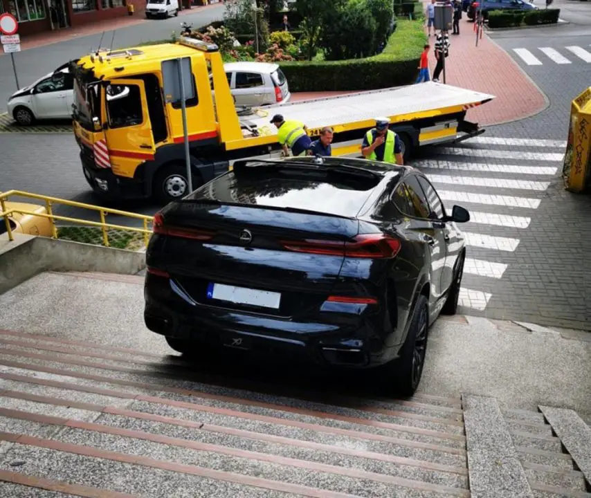 Samochód utknął na stopniach i został uszkodzony. Niezbędna była pomoc pomocy drogowej. Roztargniony kierowca został ukarany mandat i czeka go naprawa swojego nowego pojazdu.
