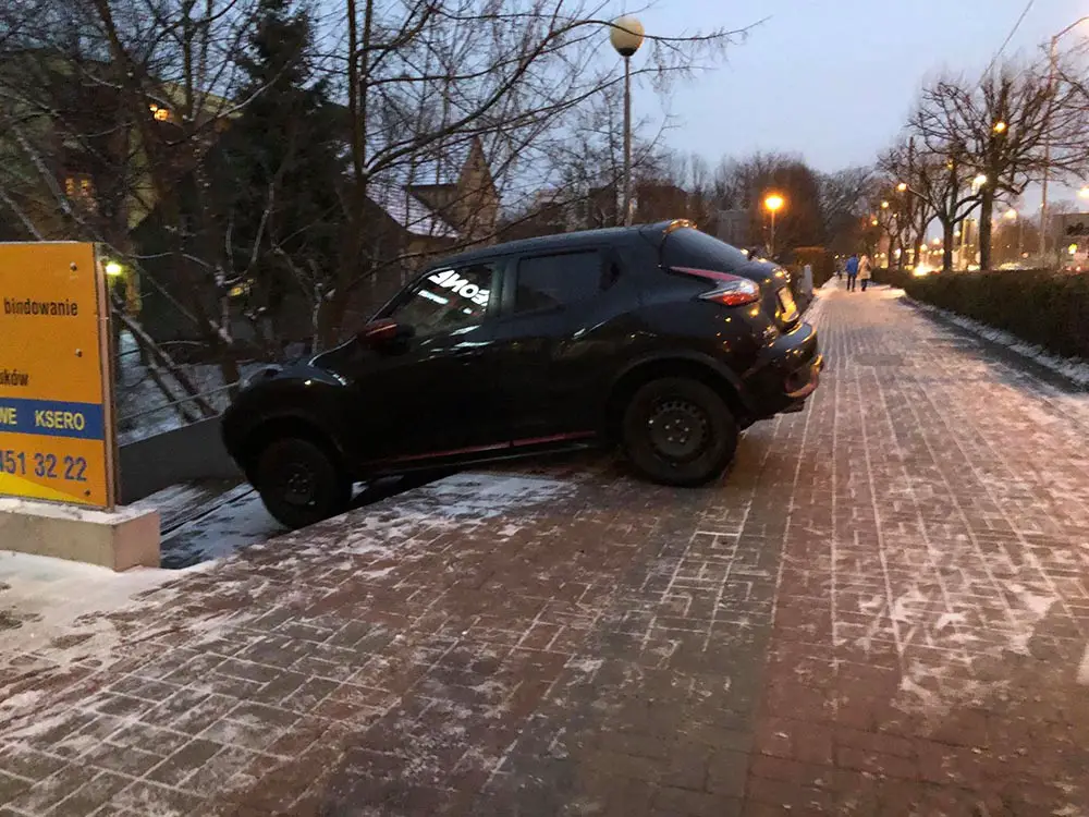 Kierująca nissanem w piątek, 11 stycznia, zamiast wycofać z parkingu koło Neonetu na ul. Wojska Polskiego pojechała do przodu i zjechała ze schodów.